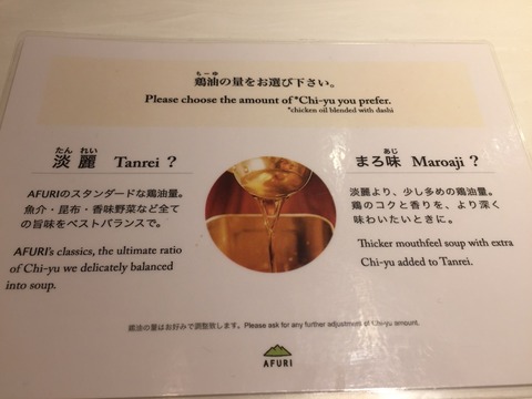 ちなみに、「鶏油」の量を選べます。「鶏油」はスープにコクとまろやかさを添える油だそうです
