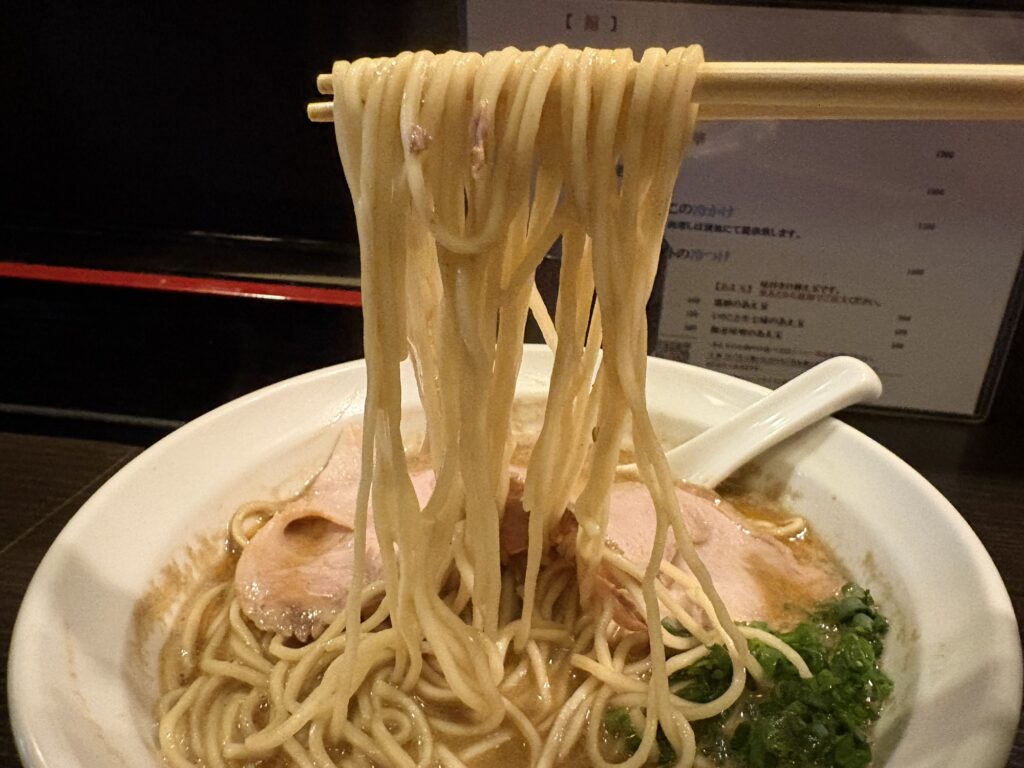やや硬めでパツパツの食感を楽しめます。これが煮干しスープとよく絡んで、口の中で煮干しの旨みと小麦の甘みが溶け合いました。