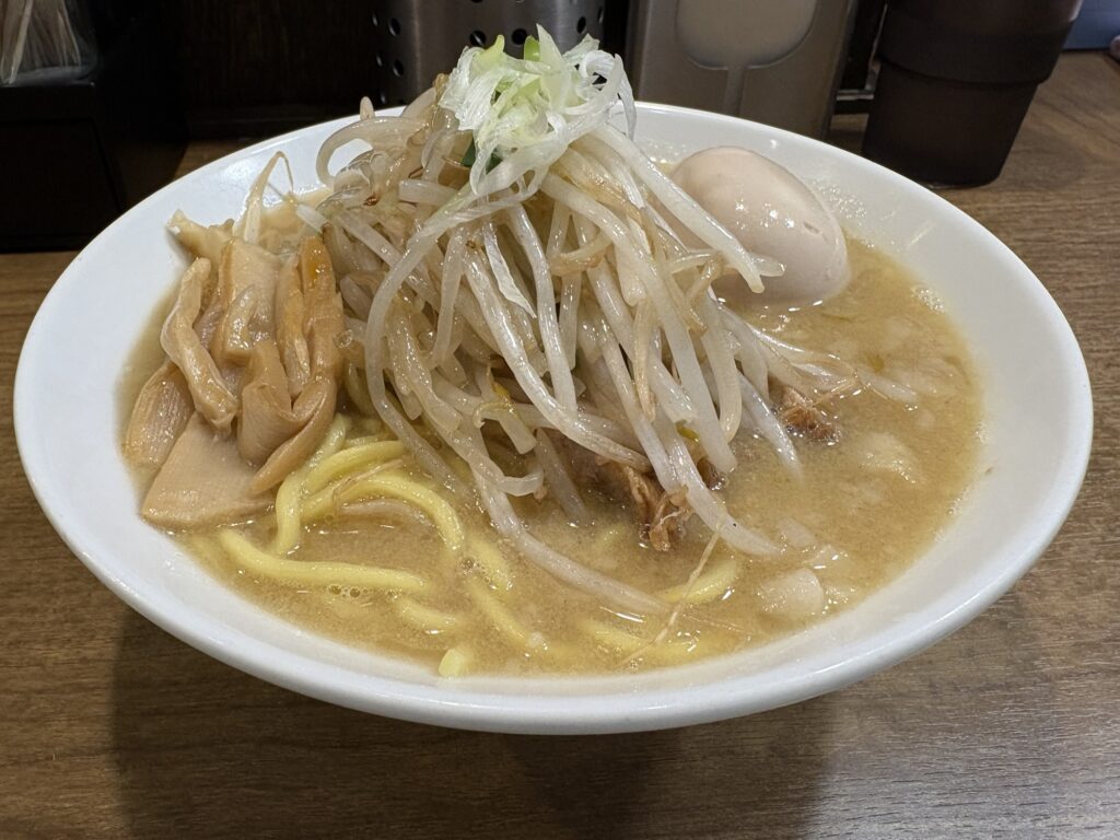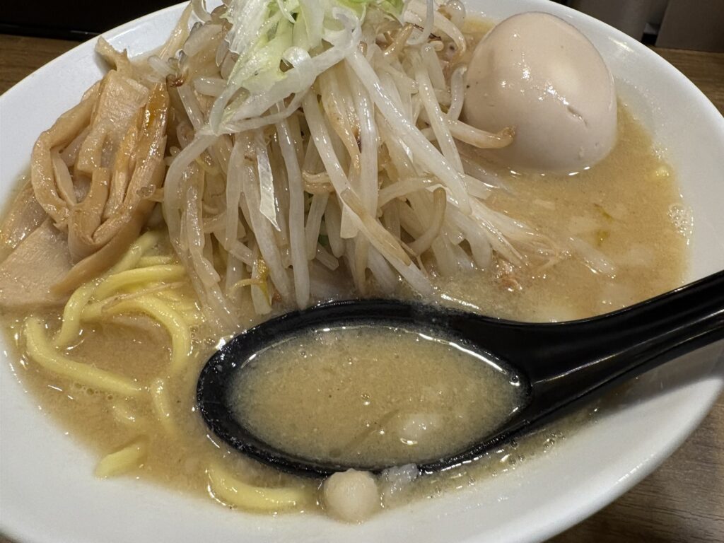 チャーシューはとろ柔ジューシー、味玉は黄身がとろける絶妙な半熟具合。さらに炒めたもやしがシャキシャキとした食感で、濃厚なスープに良いアクセントを加えています。