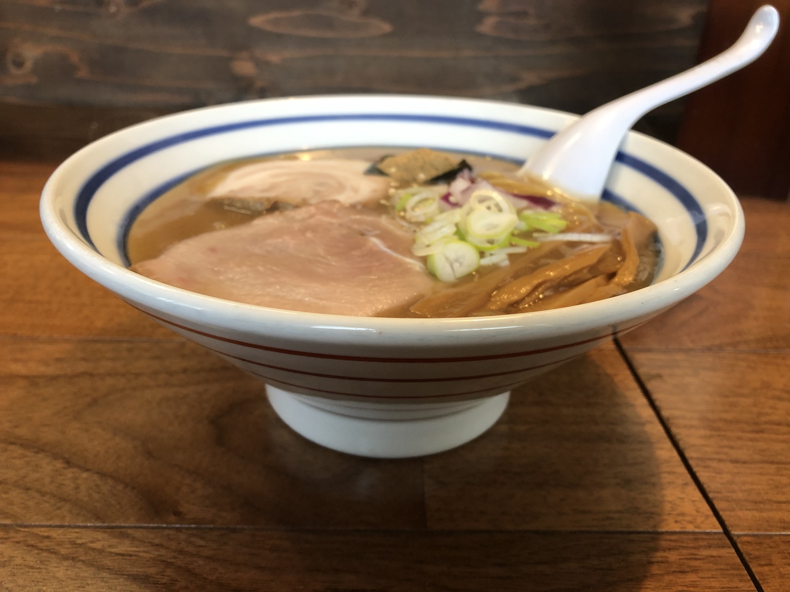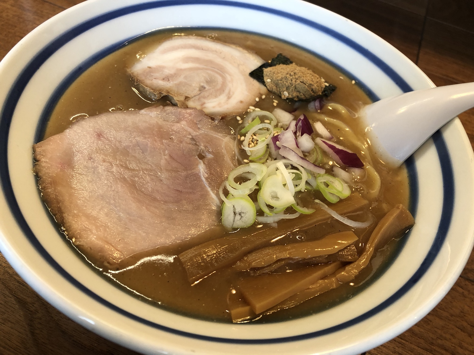 具材は、チャーシュー、ねぎ、玉ねぎ、のり、魚粉、メンマ。