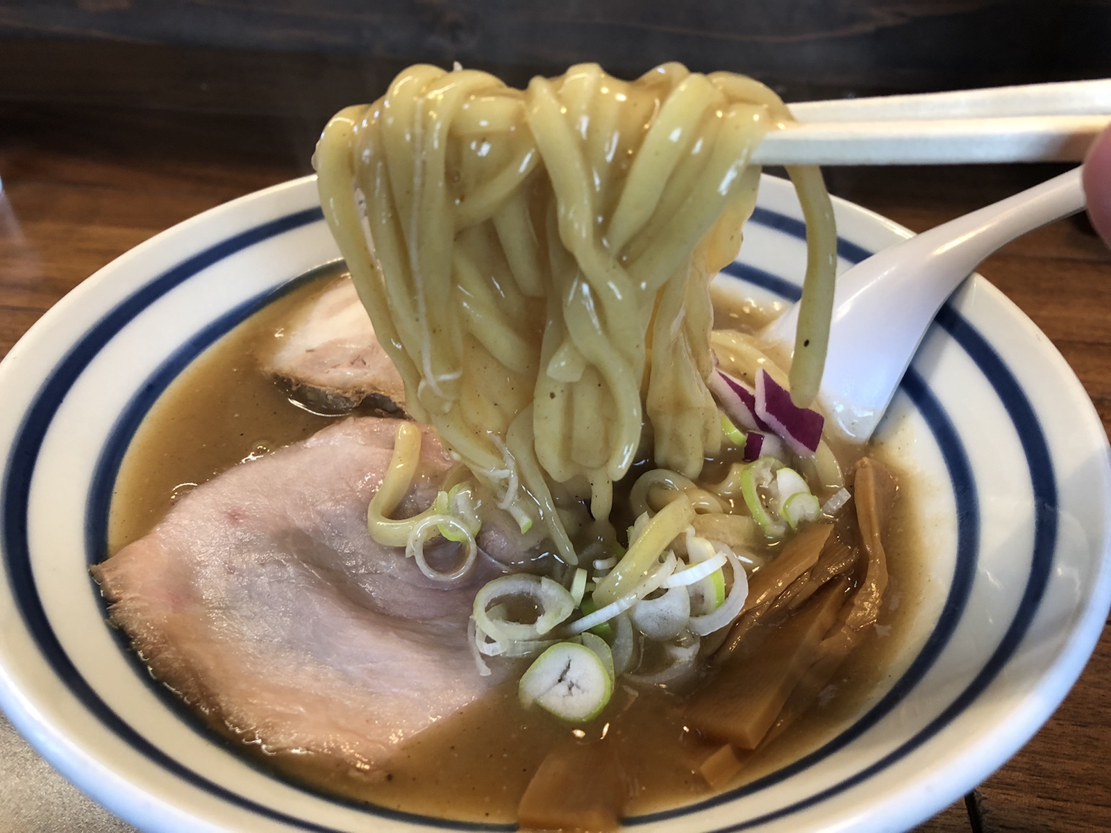 太麺が餡のようなスープに絡みついて、噛むほどに小麦と魚介の香りが錯綜します。