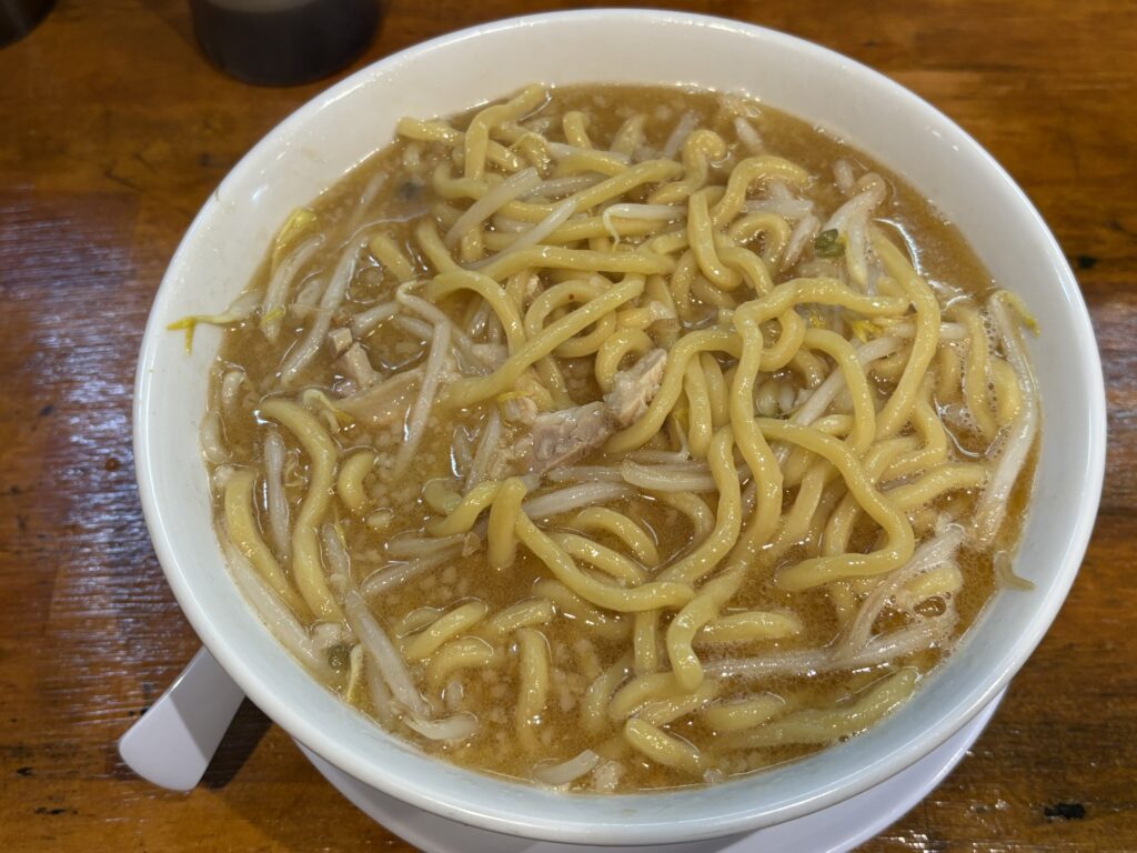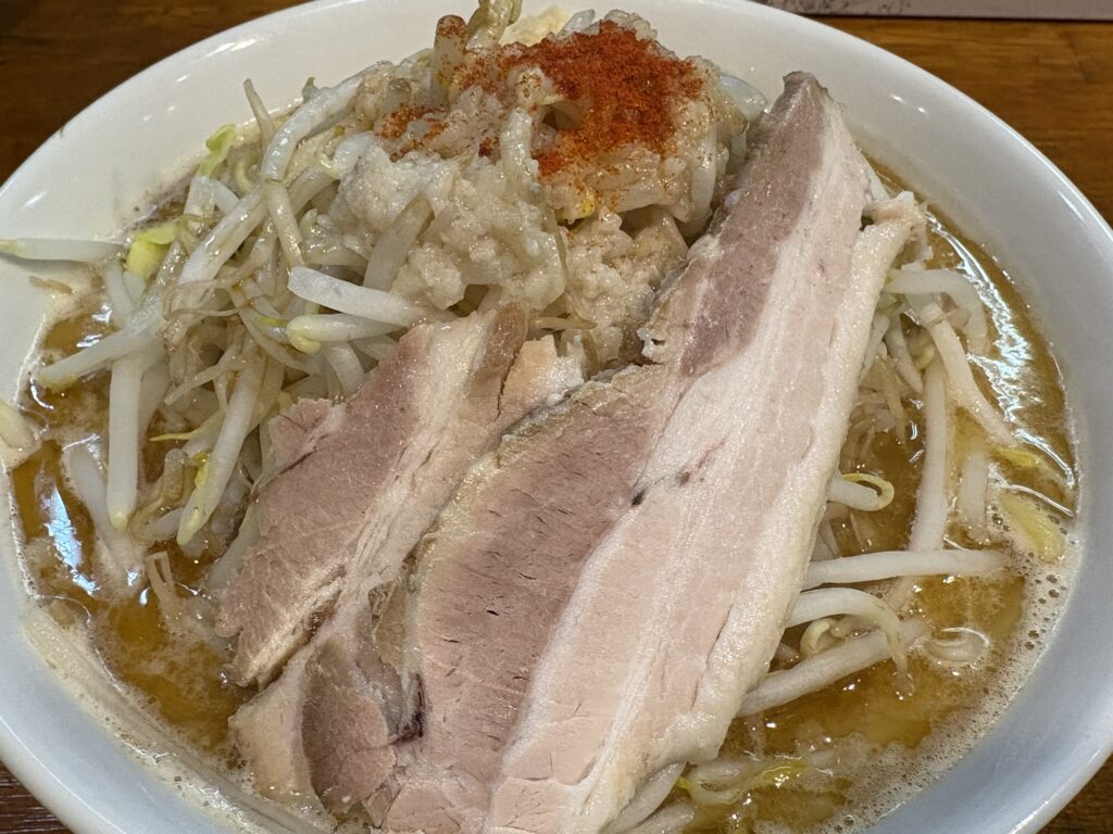 どーん!圧巻の丼姿に息をのみます。まず目を引くのが、山のように盛られたもやし。その頂に背脂が乗せられています。