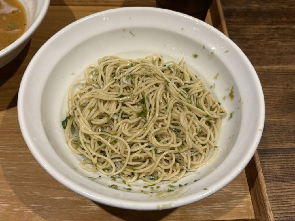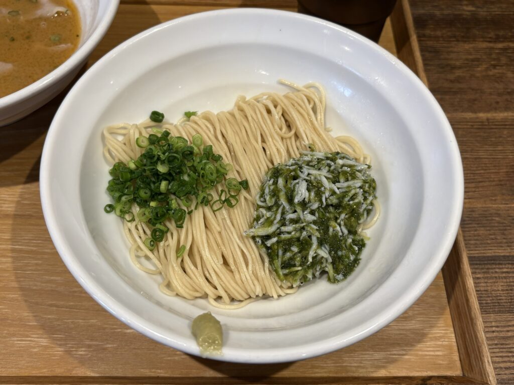 たまらず、追加で〆の和え玉をオーダー。この日の限定「生青海苔としらすの和え玉」を注文です。