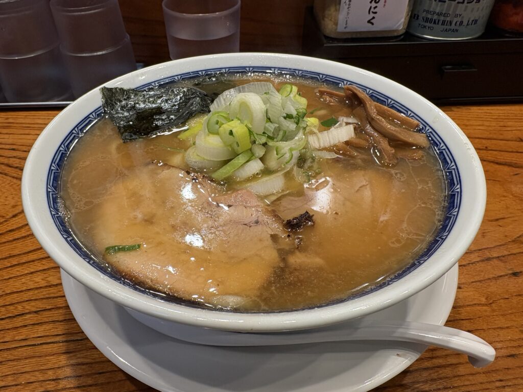 具材は、チャーシュー、ネギ、めんま、のりと、中華そば王道のラインナップ。