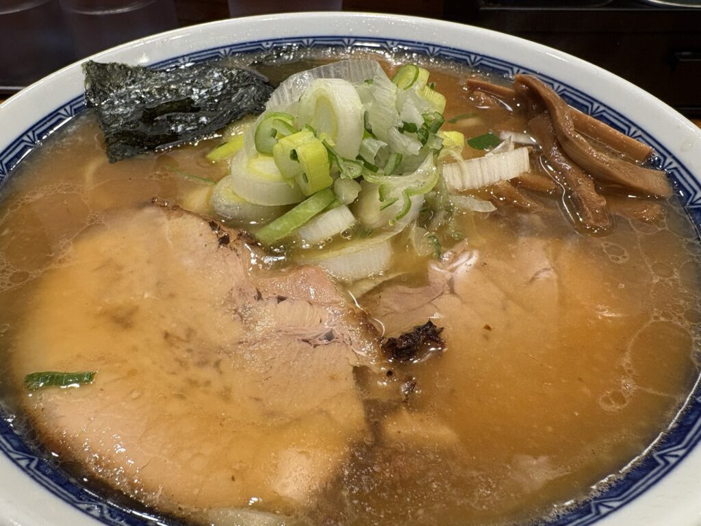 大ぶりのチャーシューは、口の中でホロリとほどける柔らかさ。厚切りのネギは、歯ごたえ抜群のシャキシャキ食感でした。