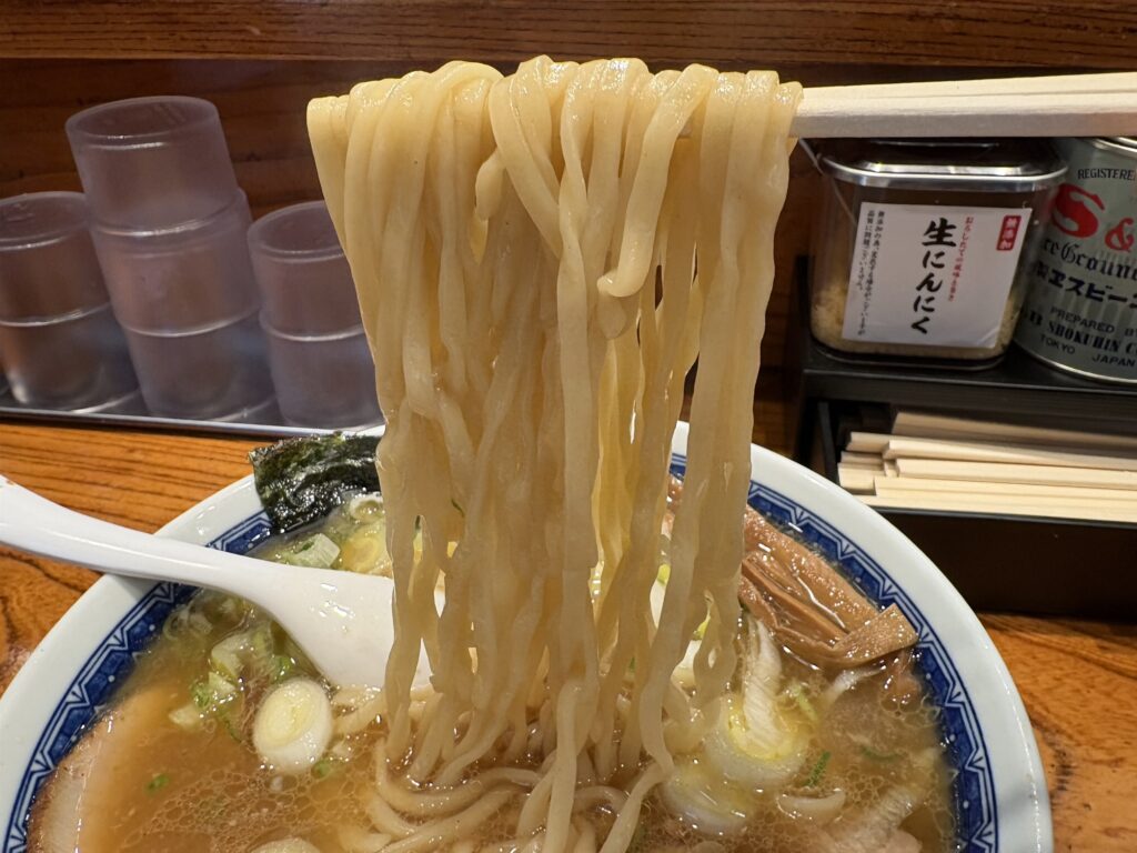 噛むともちもちとした弾力があり、食べ応え抜群。スープをよく持ち上げるので、すするほどに醤油の旨みと小麦の甘みが溶け合います。