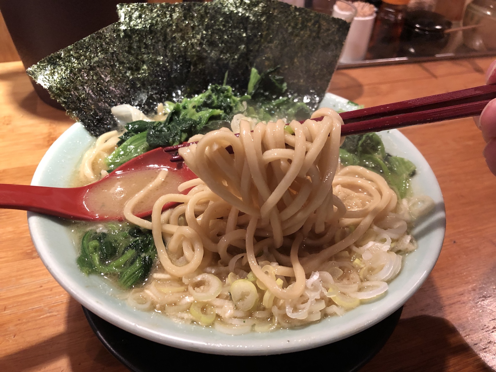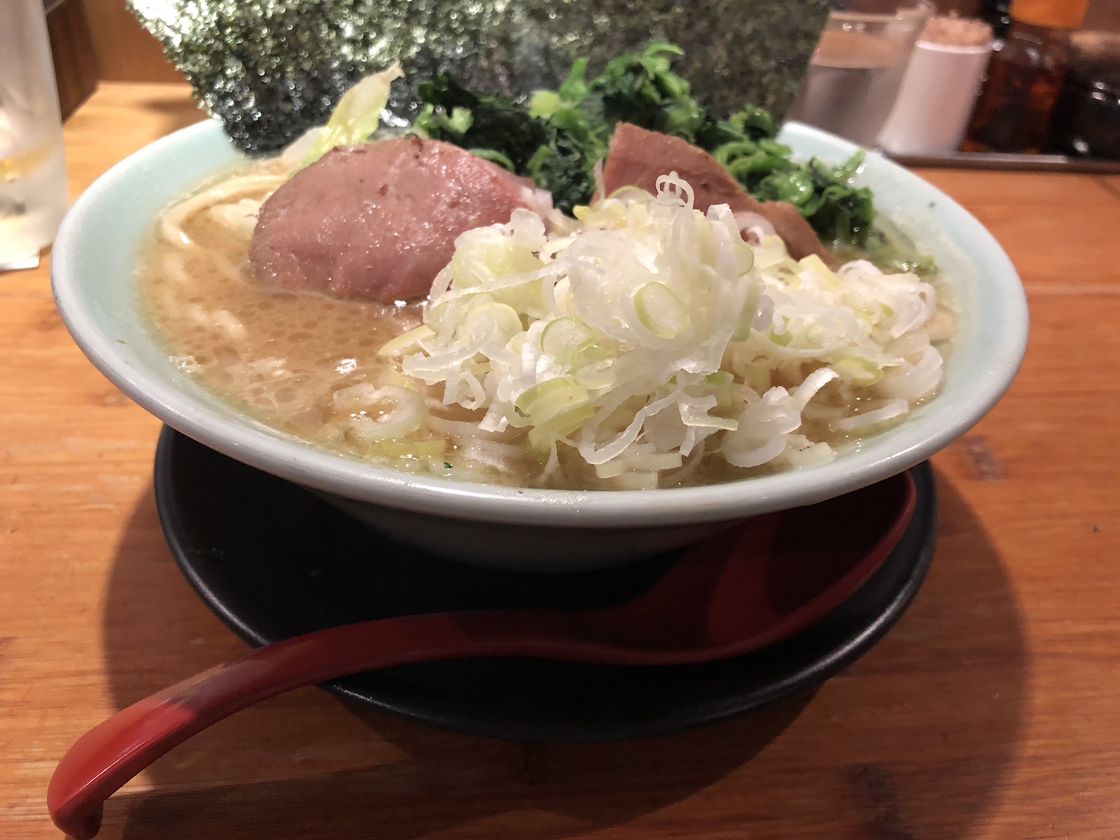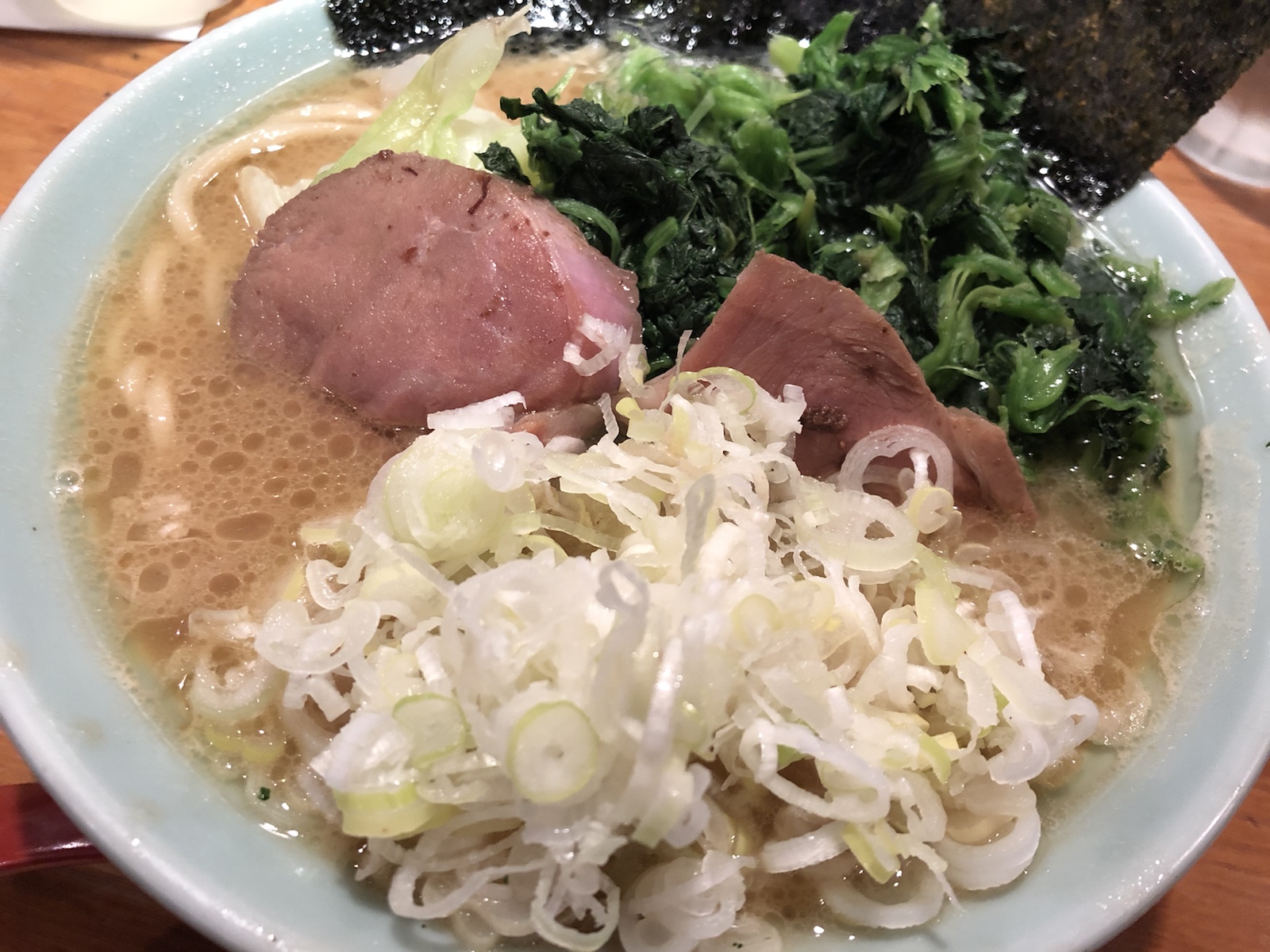 見事な家系のたたずまい。ねぎとほうれん草を増したので、「家系」観も増しました。