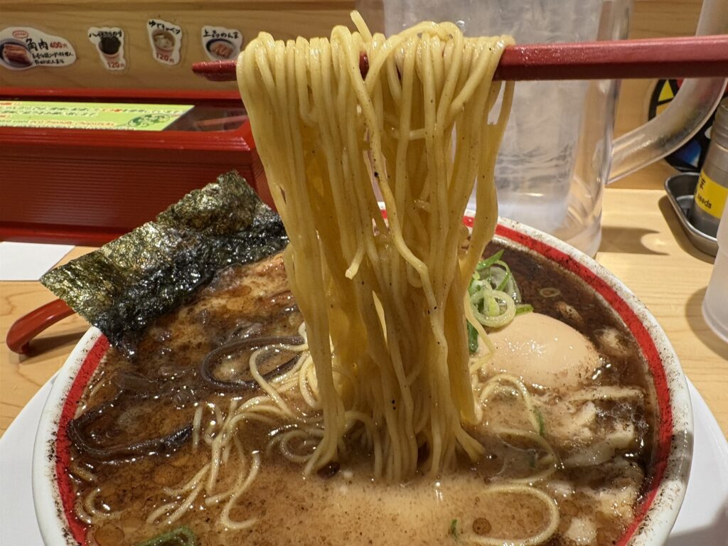 麺は、九州豚骨ラーメンの代名詞とも言える極細のストレート麺。