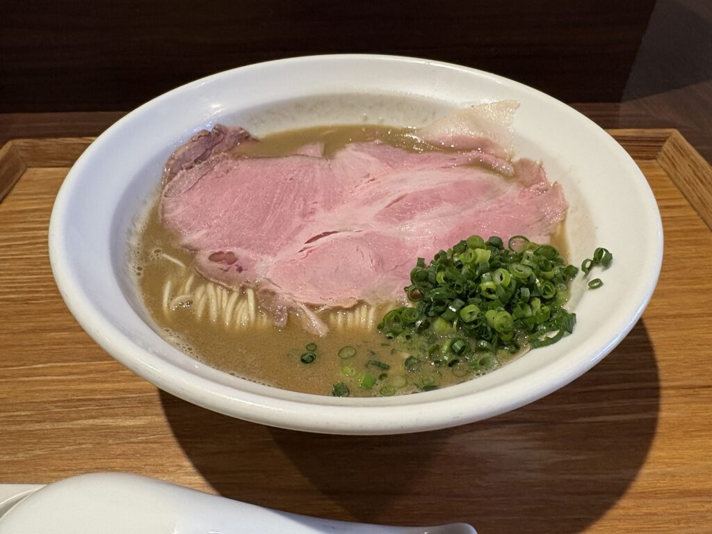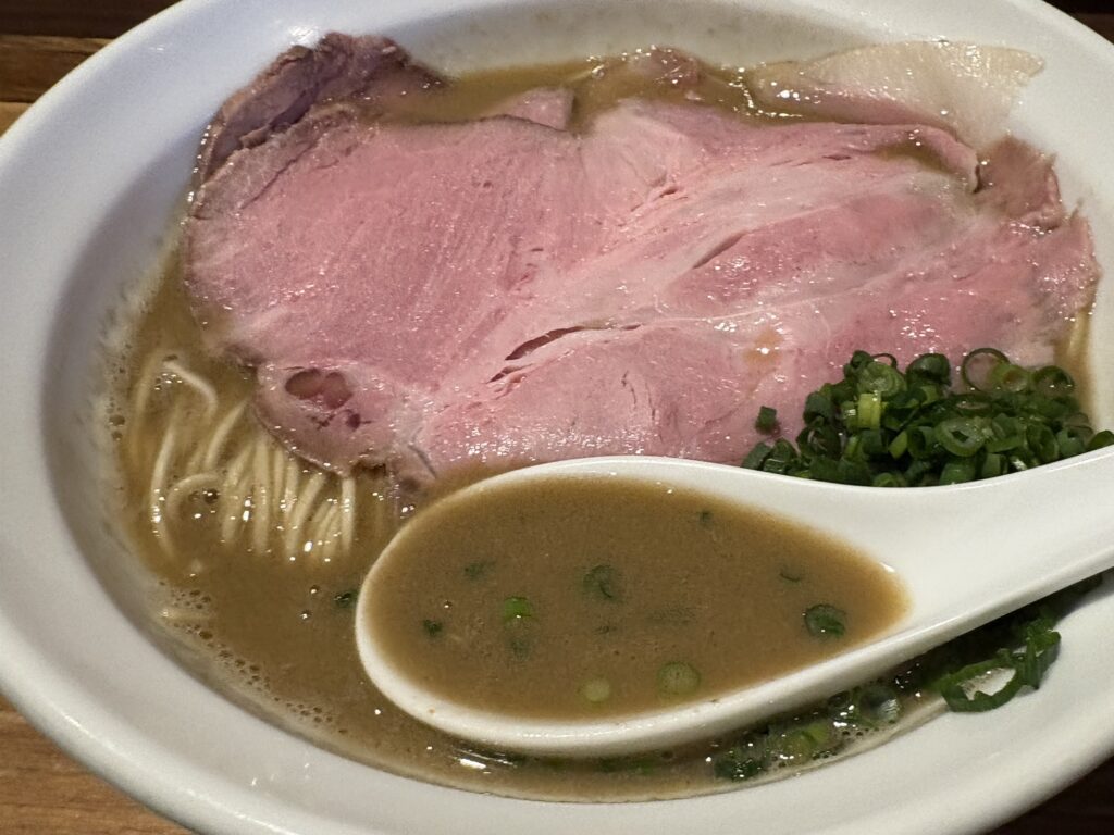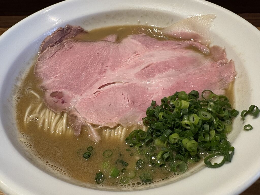 具材は、レアチャーシュー、ネギ。麺とスープを引き立てるシンプルなラインナップです。