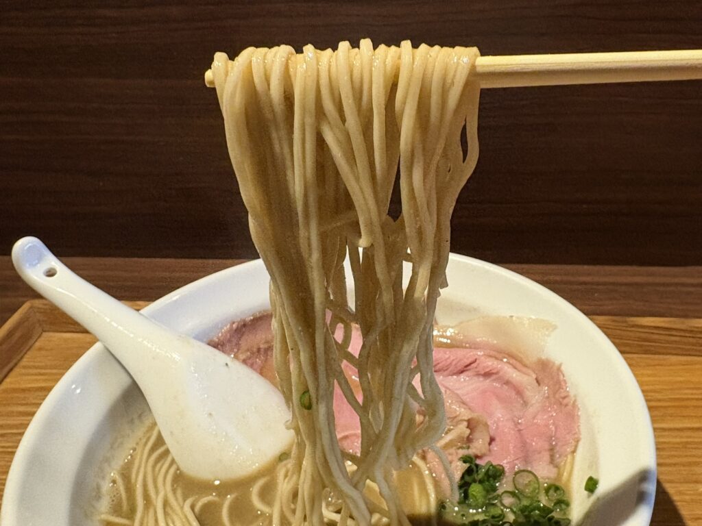この力強いスープに合わせるのは、店特製の歯切れのよい細ストレート麺。硬めに茹で上げられていてパツッとした食感が特徴です。