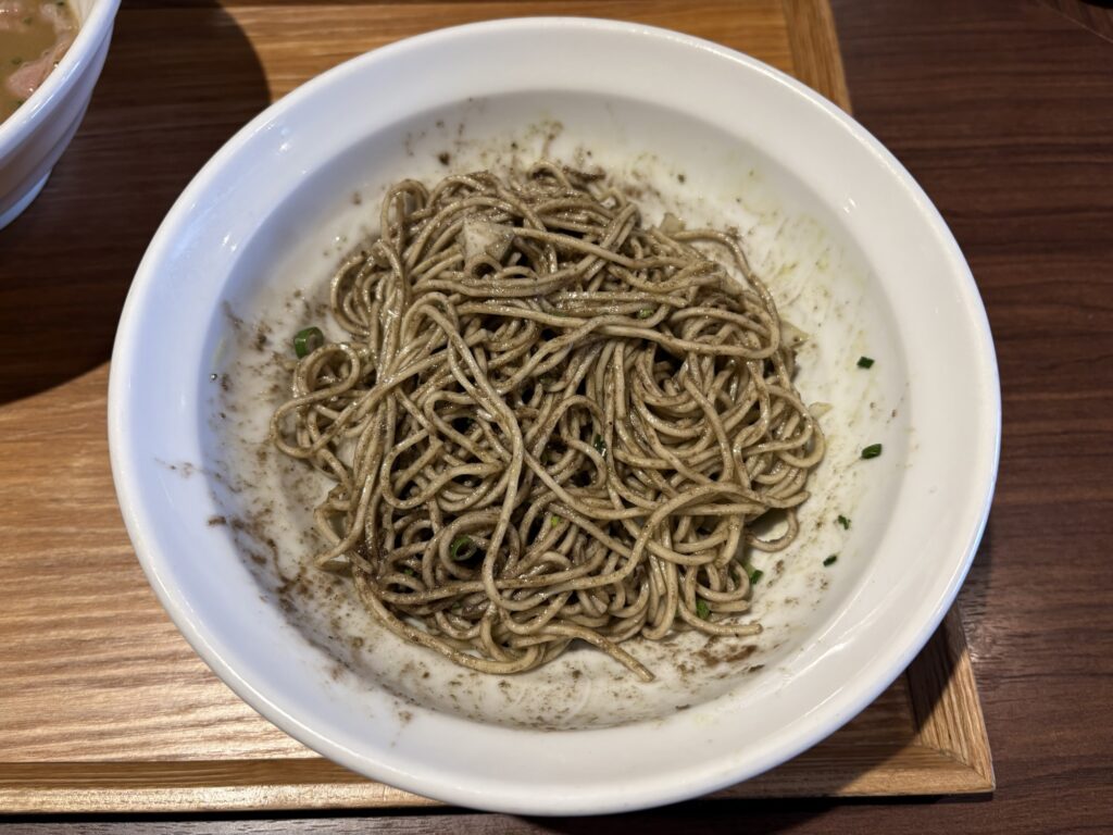 こちらも着丼した途端に声が漏れるほどインパクトあるビジュアル。箸でぐるぐるかき混ぜて、ズズっとすすり上げると、イカ墨の苦みと青唐辛子の辛味が絶妙なコラボを放ちました。