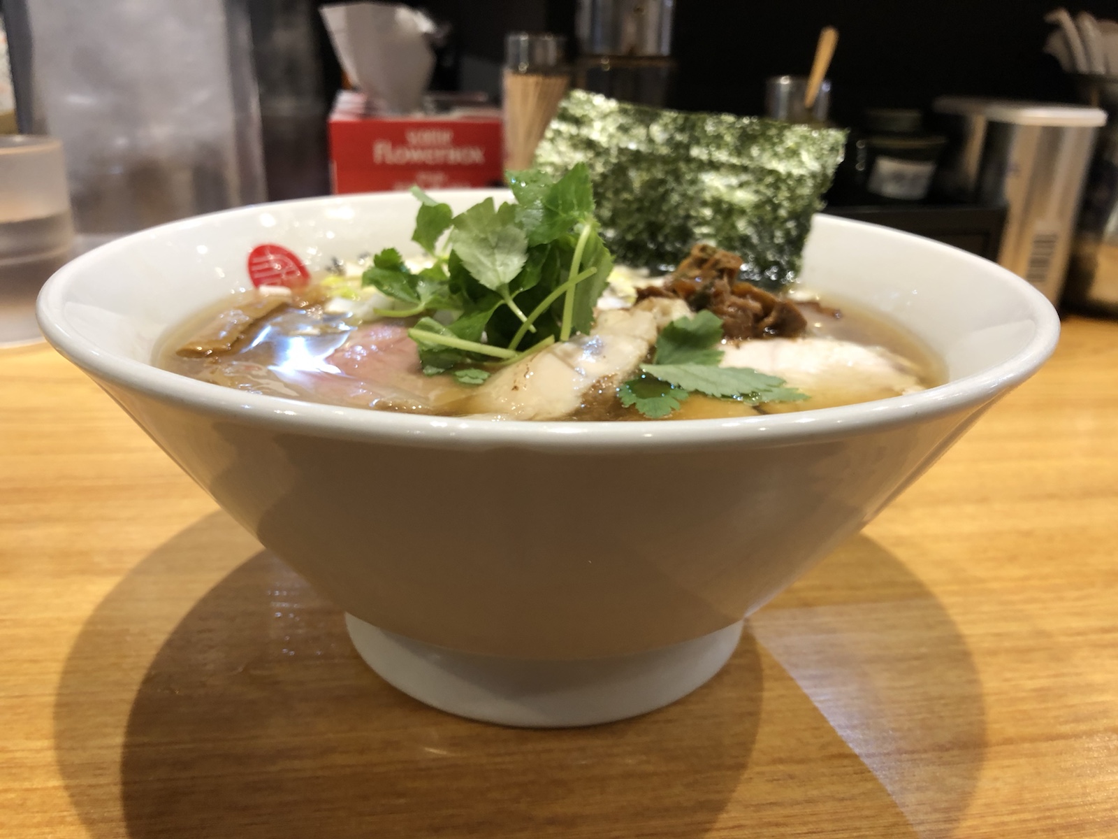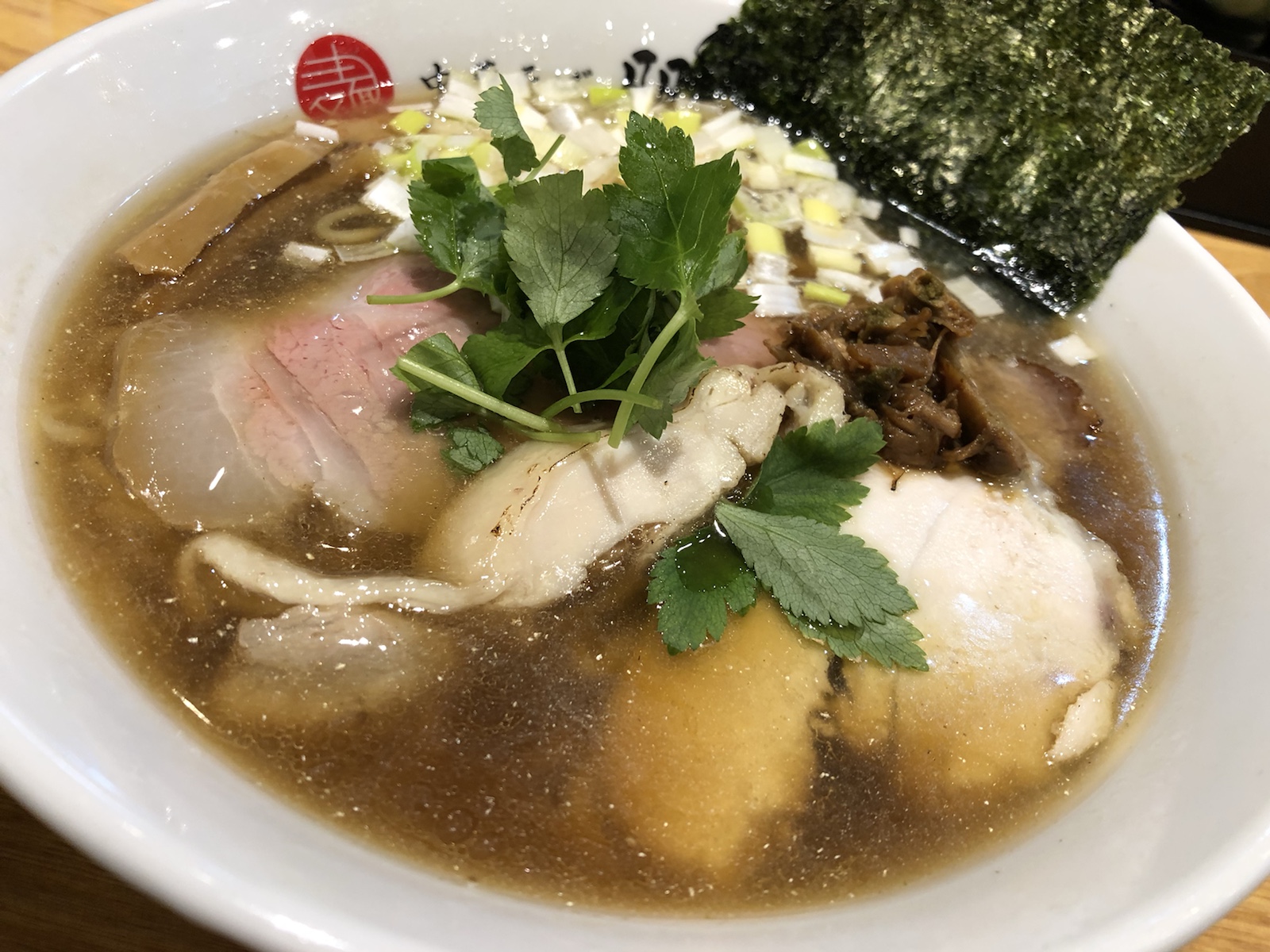 具材は、鶏と豚のチャーシュー、のり、あさり、穂先メンマ、ネギ、セリ。