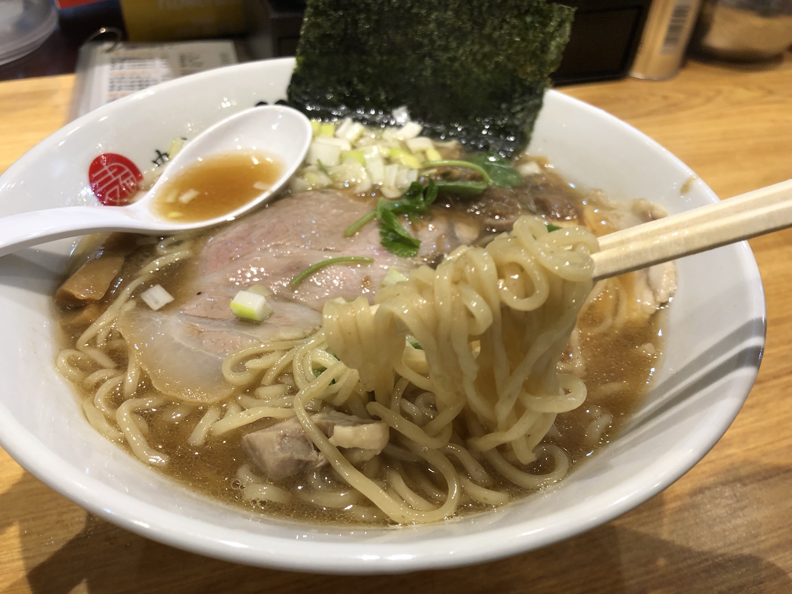 まずはスープをひと口。なんともやさしい煮干し醤油スープです。
