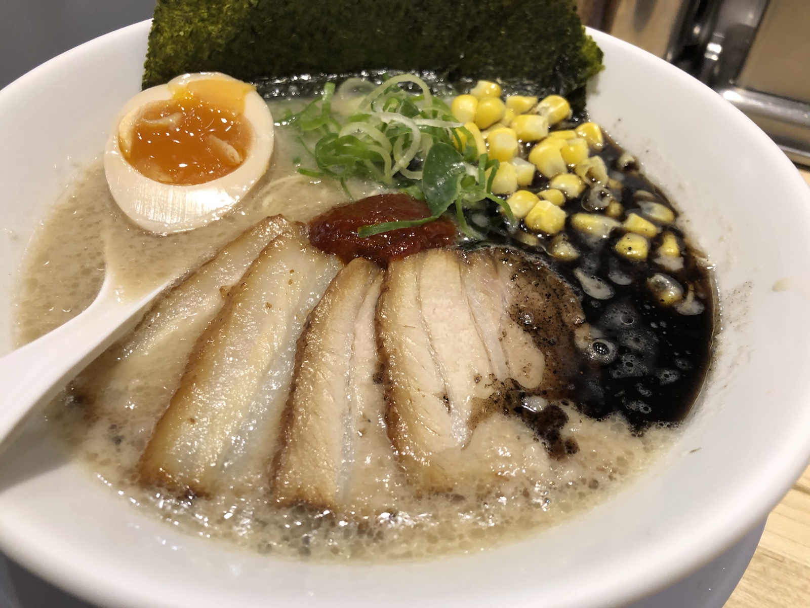 具材は、チャーシュー、もやし、ねぎ、のり、半熟味玉、コーン。
