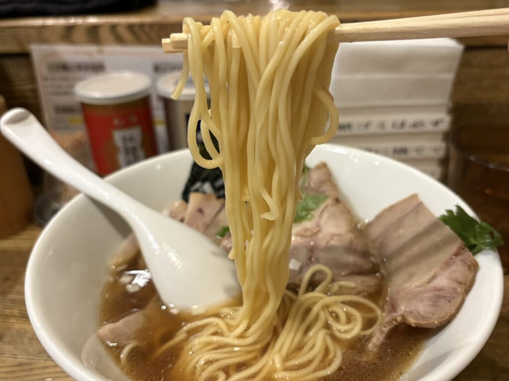 やや硬めで歯切れがよく、煮干しスープとの相性抜群。すすり上げるほどに、煮干しの風味と小麦の甘みが絶妙に絡み合いました。