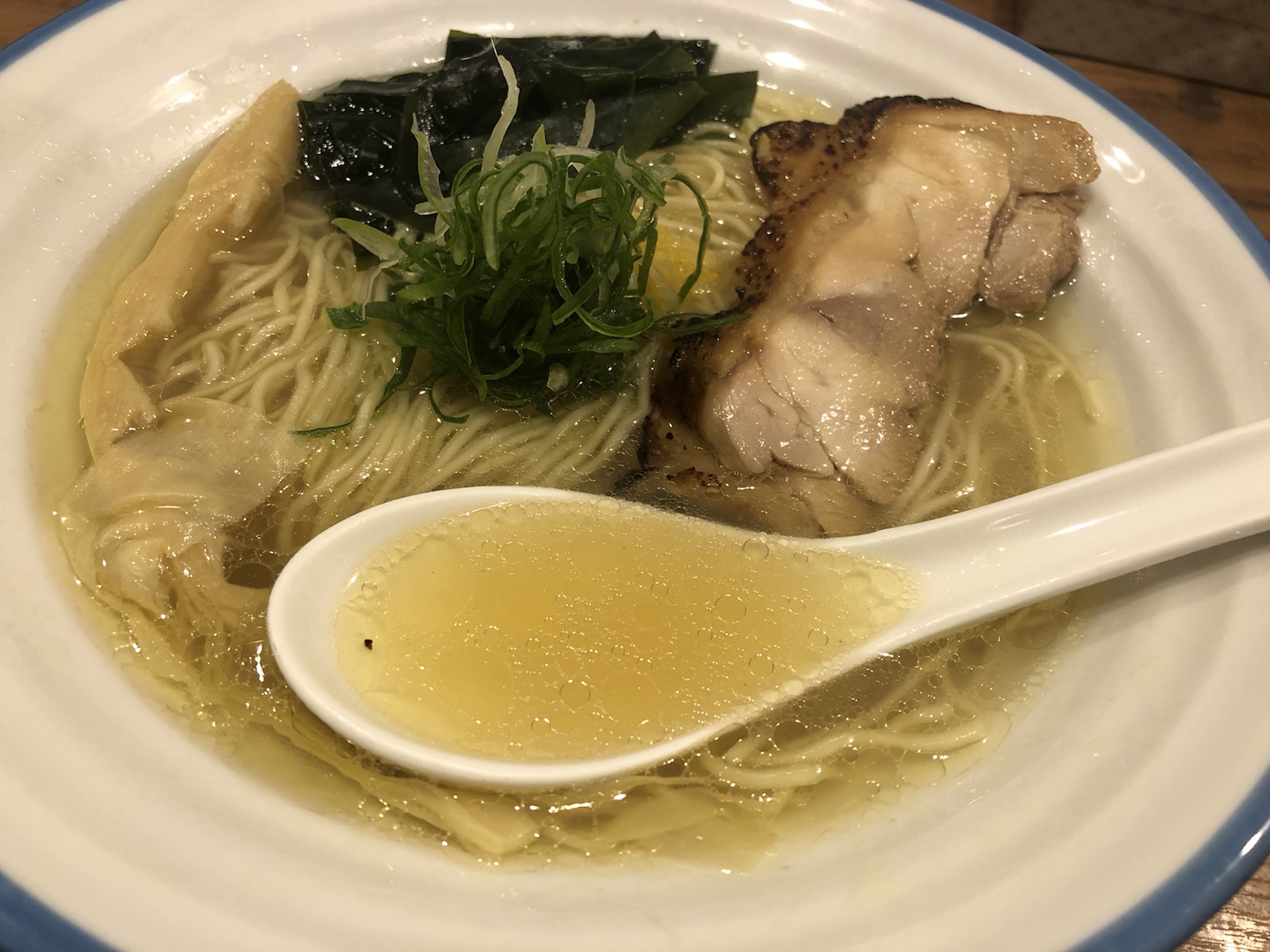 さっそく透き通った黄金色のスープに、レンゲを投入してひと口すすります。