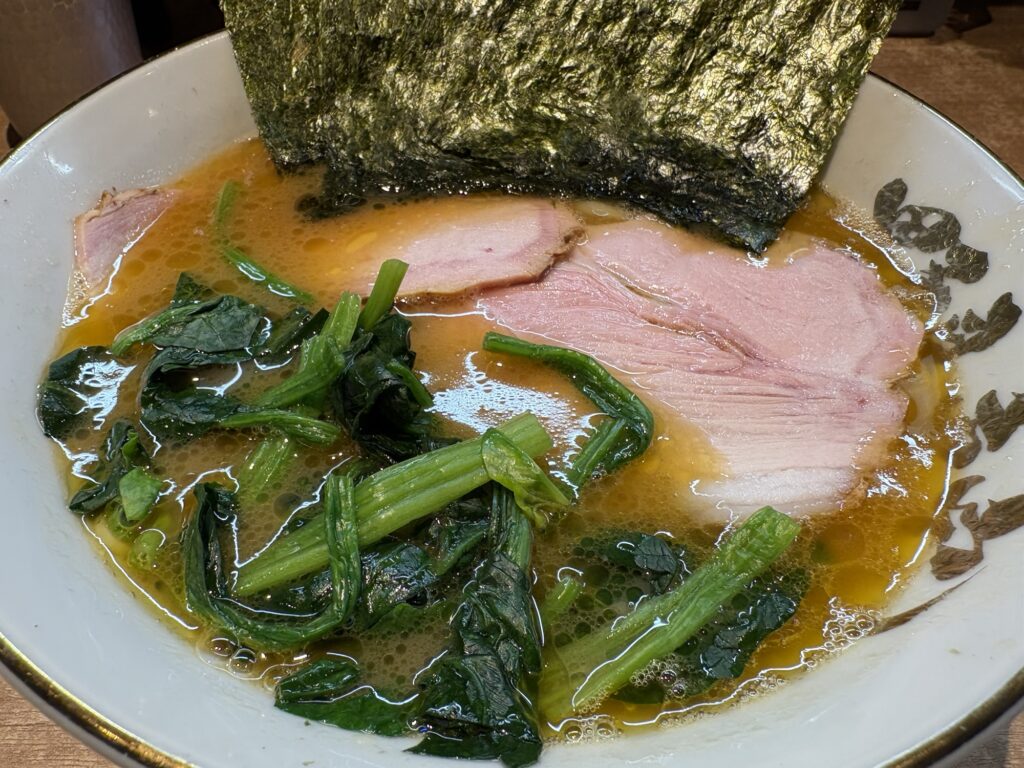 具材は、チャーシュー、のり、ほうれん草と、家系王道のラインナップ、チャーシューとのり追加です。