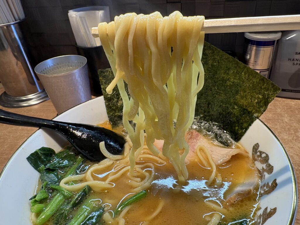 麺は、家系王道の中太ストレート麺。やや縮れが入っています。