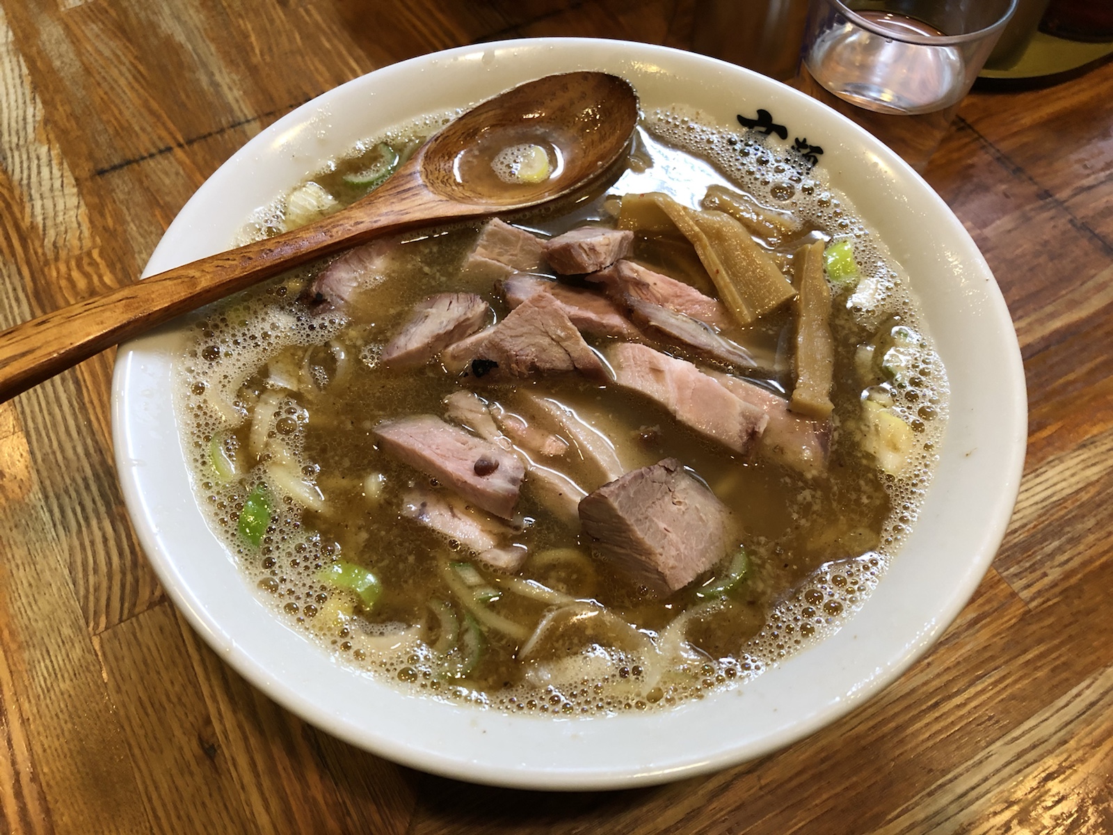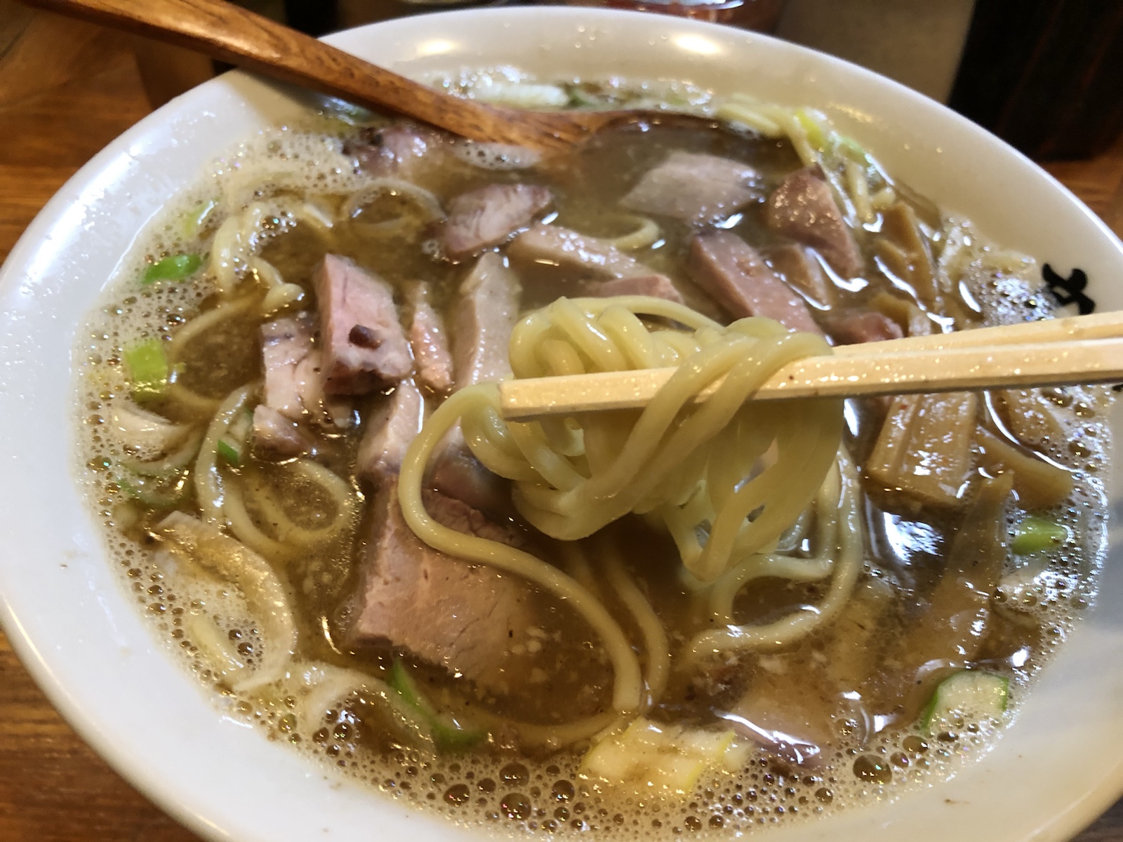 これが太めの麺によく絡みつきます。弾力があって、噛むほどにスープのダシが口の中に広がります。
