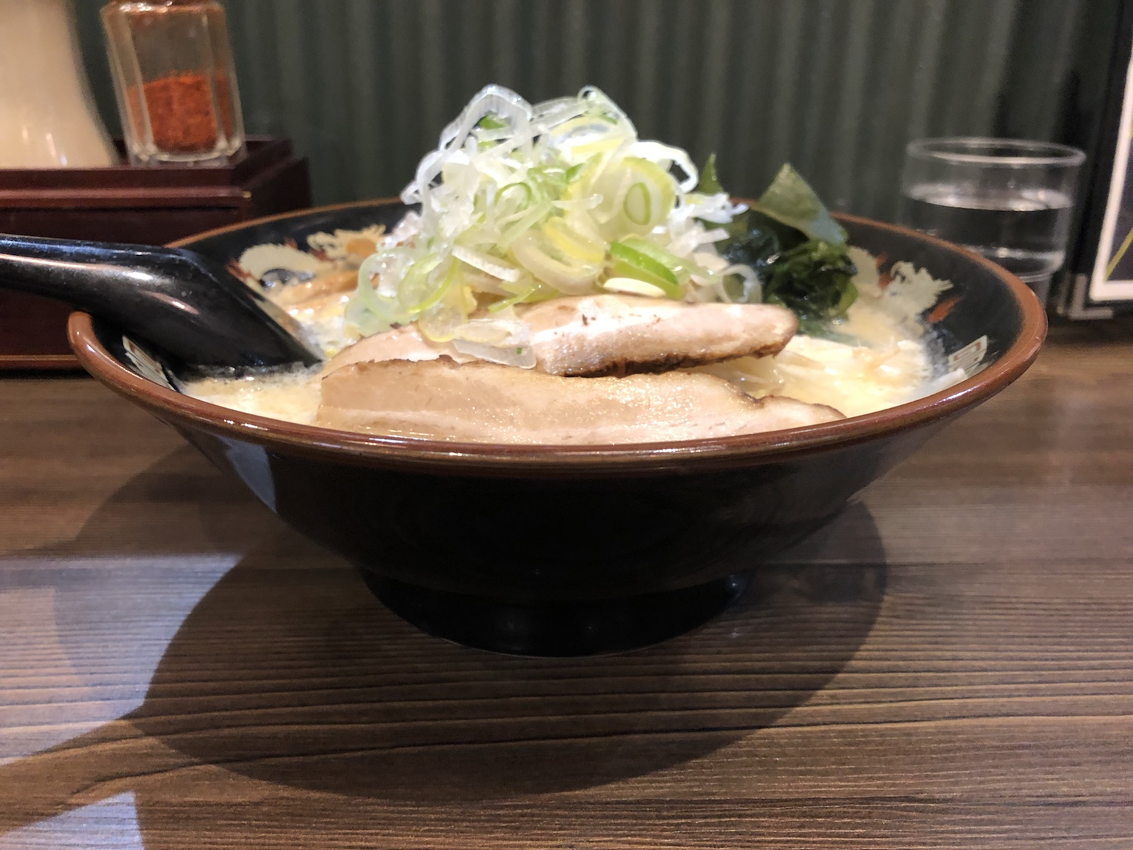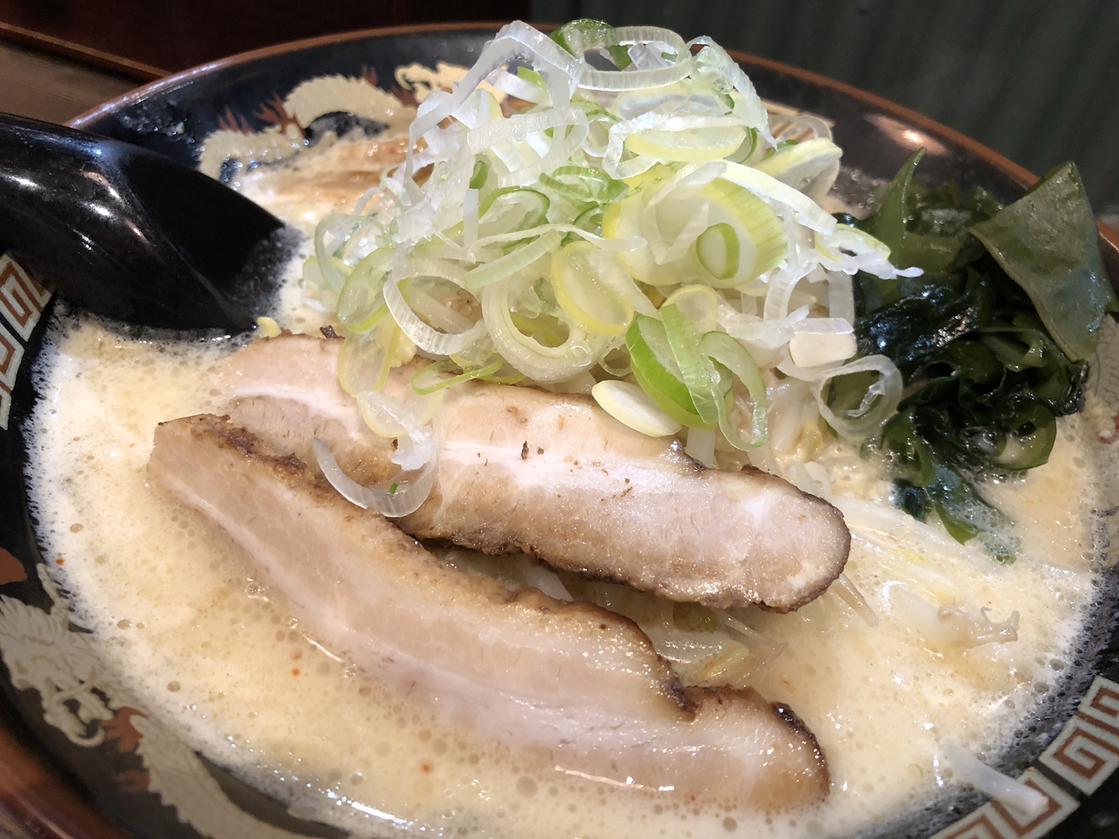チャーシューの佇まいやネギの盛り、メンマとわかめのアクセント。