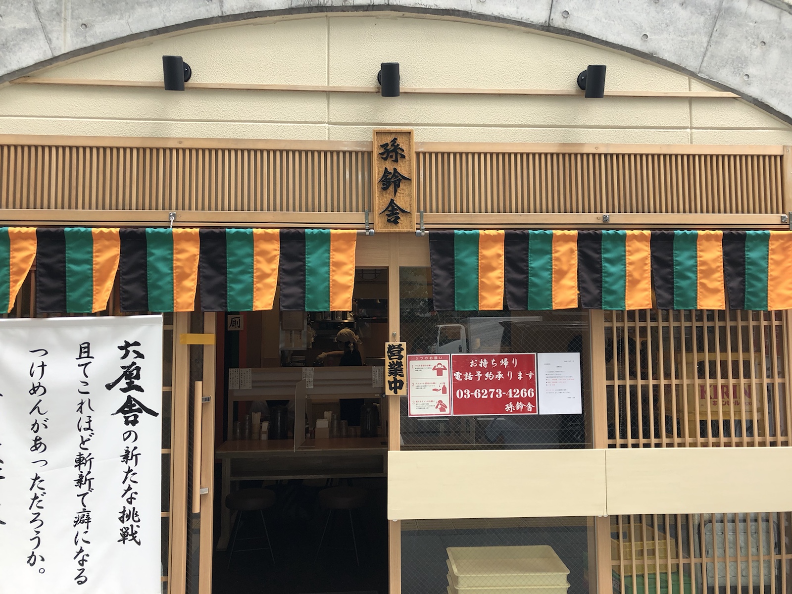 入口中央に掲げられた「孫鈴舎」の看板。店頭の垂れ幕には「六厘舎の新たな挑戦」と書かれています。