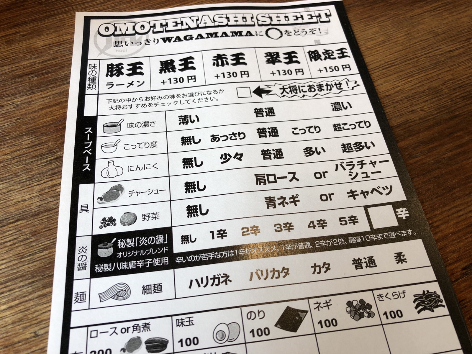 味の濃さや具、麺の硬さなどを選べます。基本は「大将におまかせ」にしつつ、辛さを3辛、麺をカタにして、店員さんに渡します。