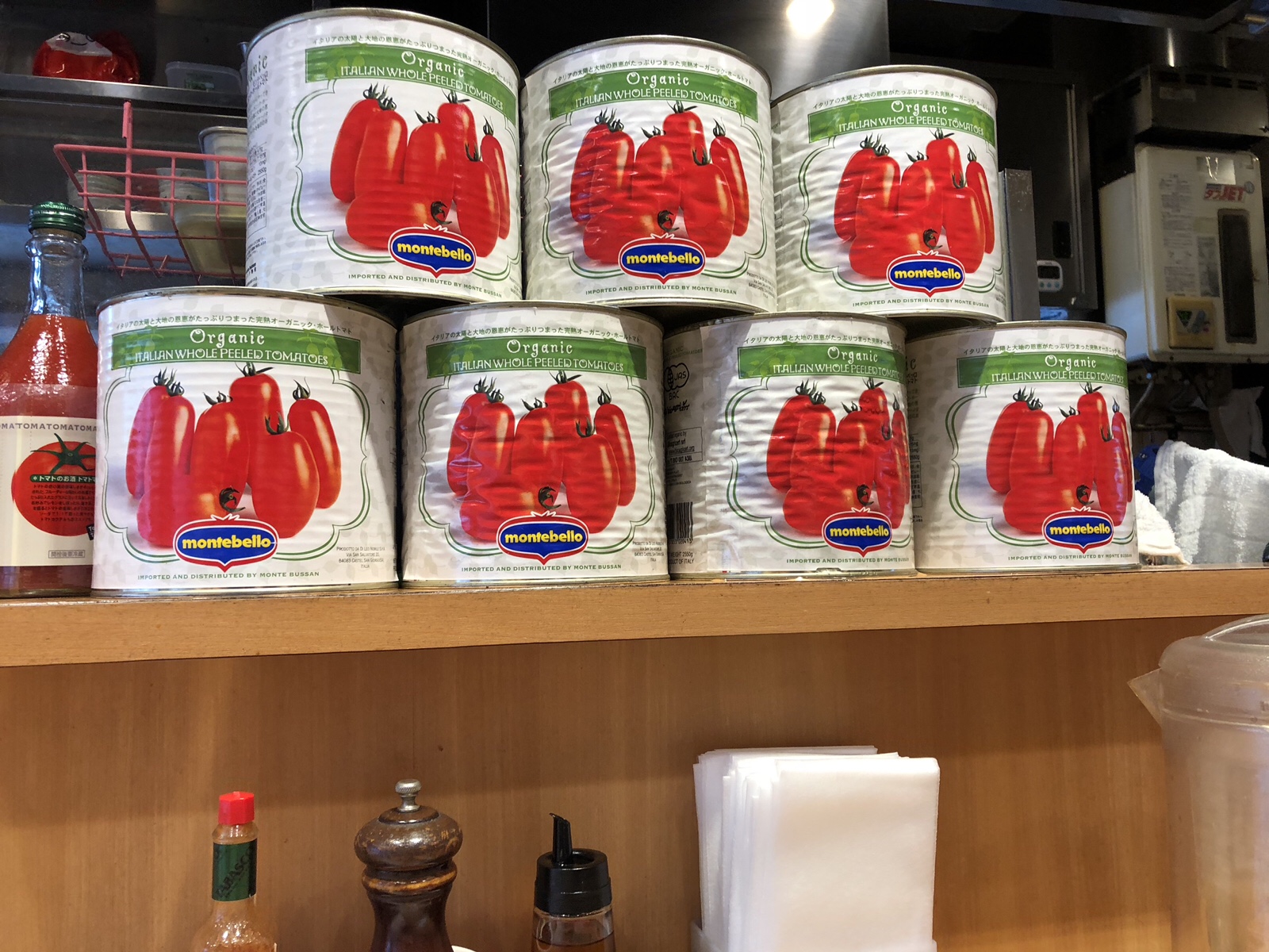 売りのトマトの缶詰がずらりとカウンターの上に並んでいます。