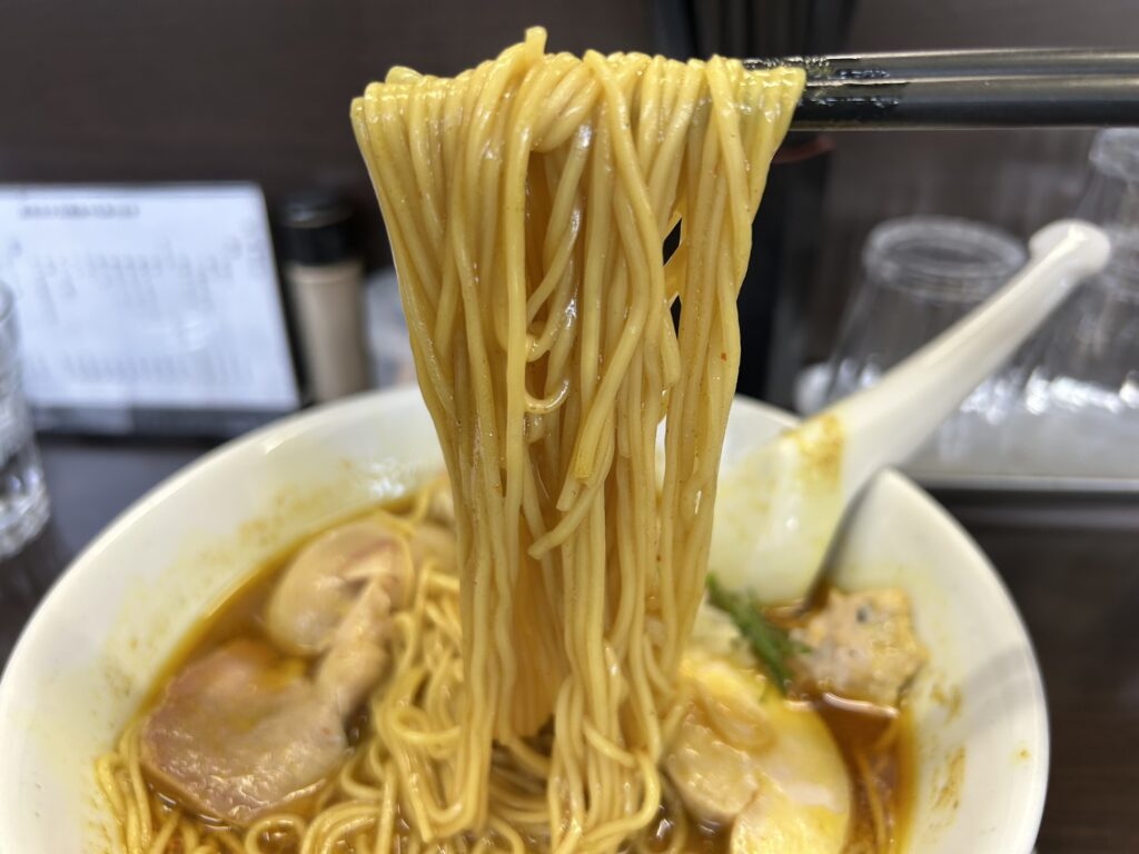この極うまカレースープと合わせる麺は、均等な太さが美しいストレートの細麺。