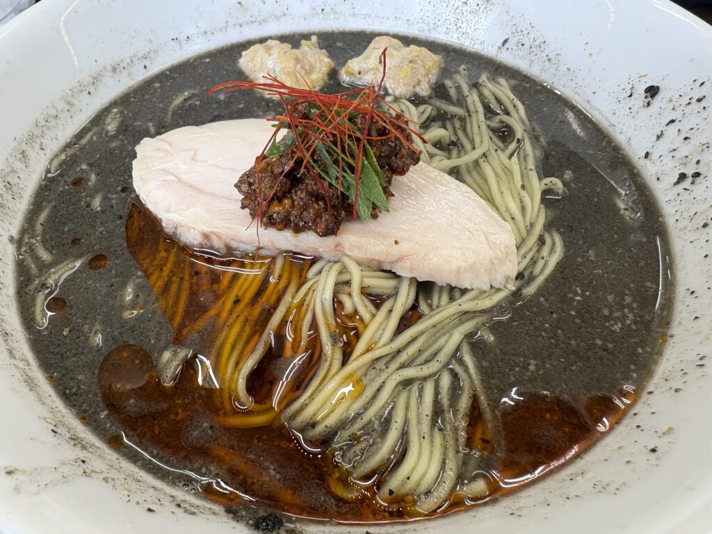 今回選んだのは、期間限定の意欲作「黒ごま担々麺」です。トッピングで「鶏つくね」を追加しました。