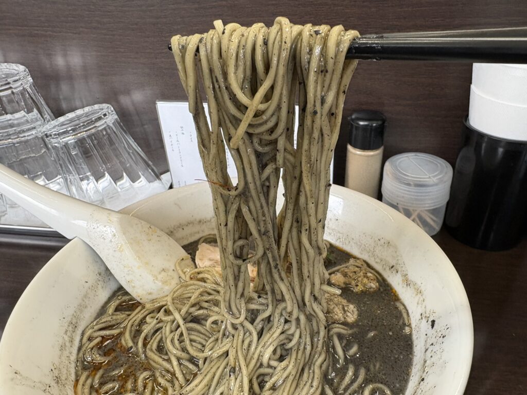 この力強いスープに合わせるのは、しなやかな細ストレート麺。麺をすするたびに、とろみある黒ごま坦々がしっかりと絡みついてきます。