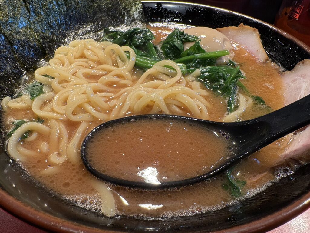 麺は、家系王道の中太ストレート麺。やや縮れが入っていてスープとよく絡みます。